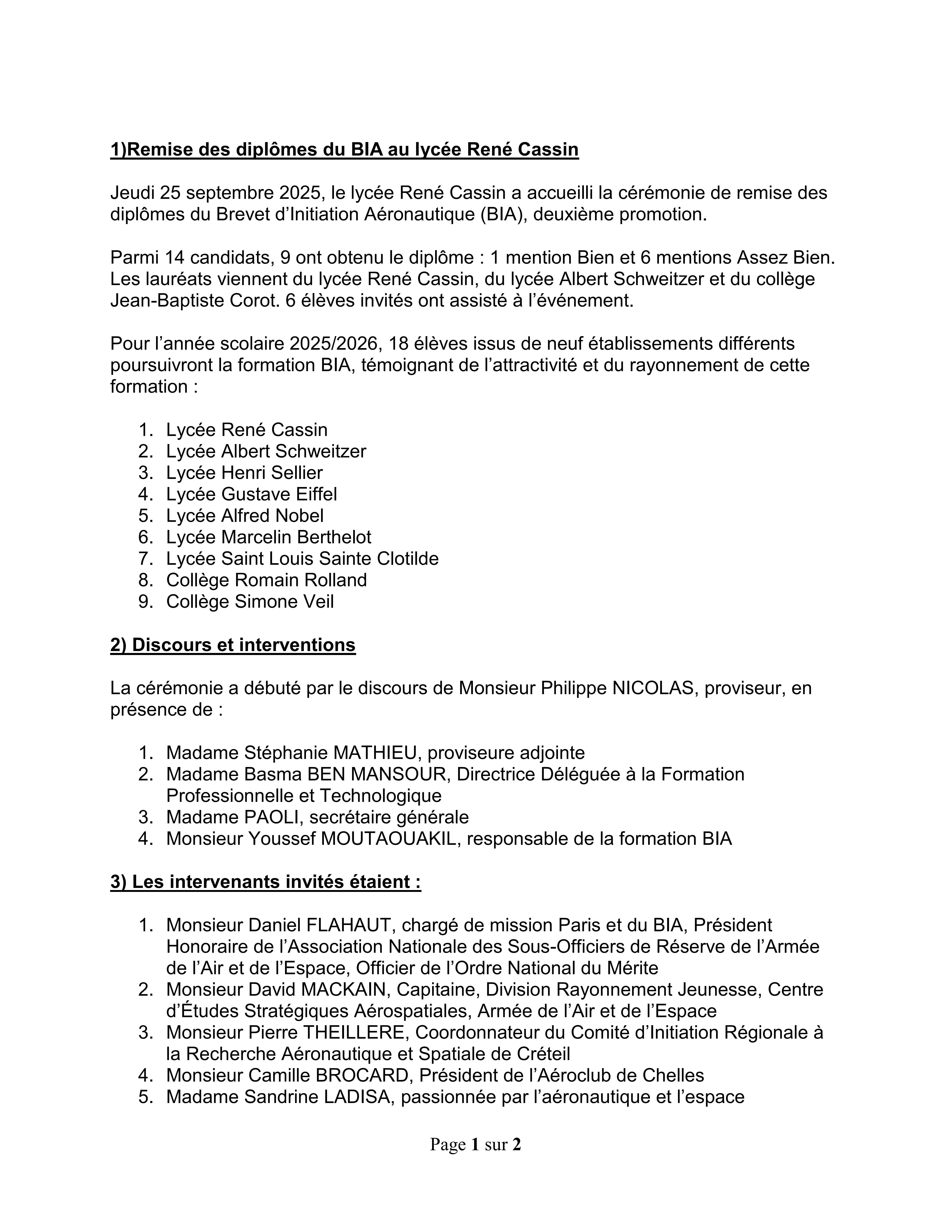 • Remise diplômes BIA Le jeudi 25 septembre 2025, le lycée René Cassin a accueilli la cérémonie de remise des diplômes du Brevet d’Initiation Aéronautique (BIA).Article complet   ...